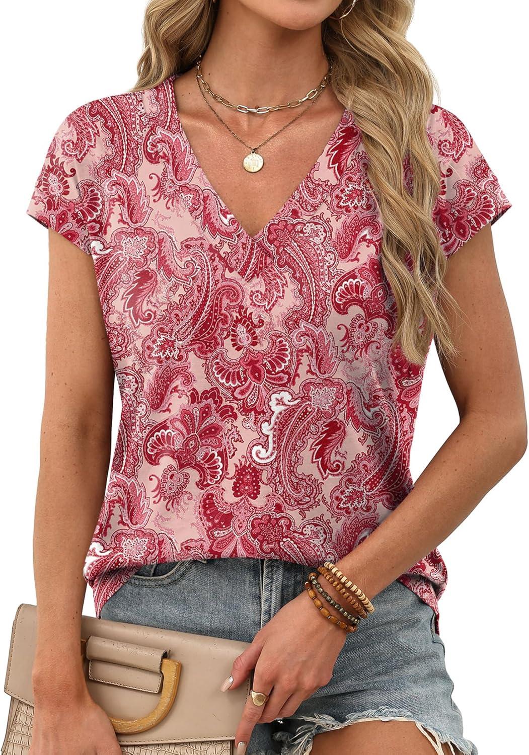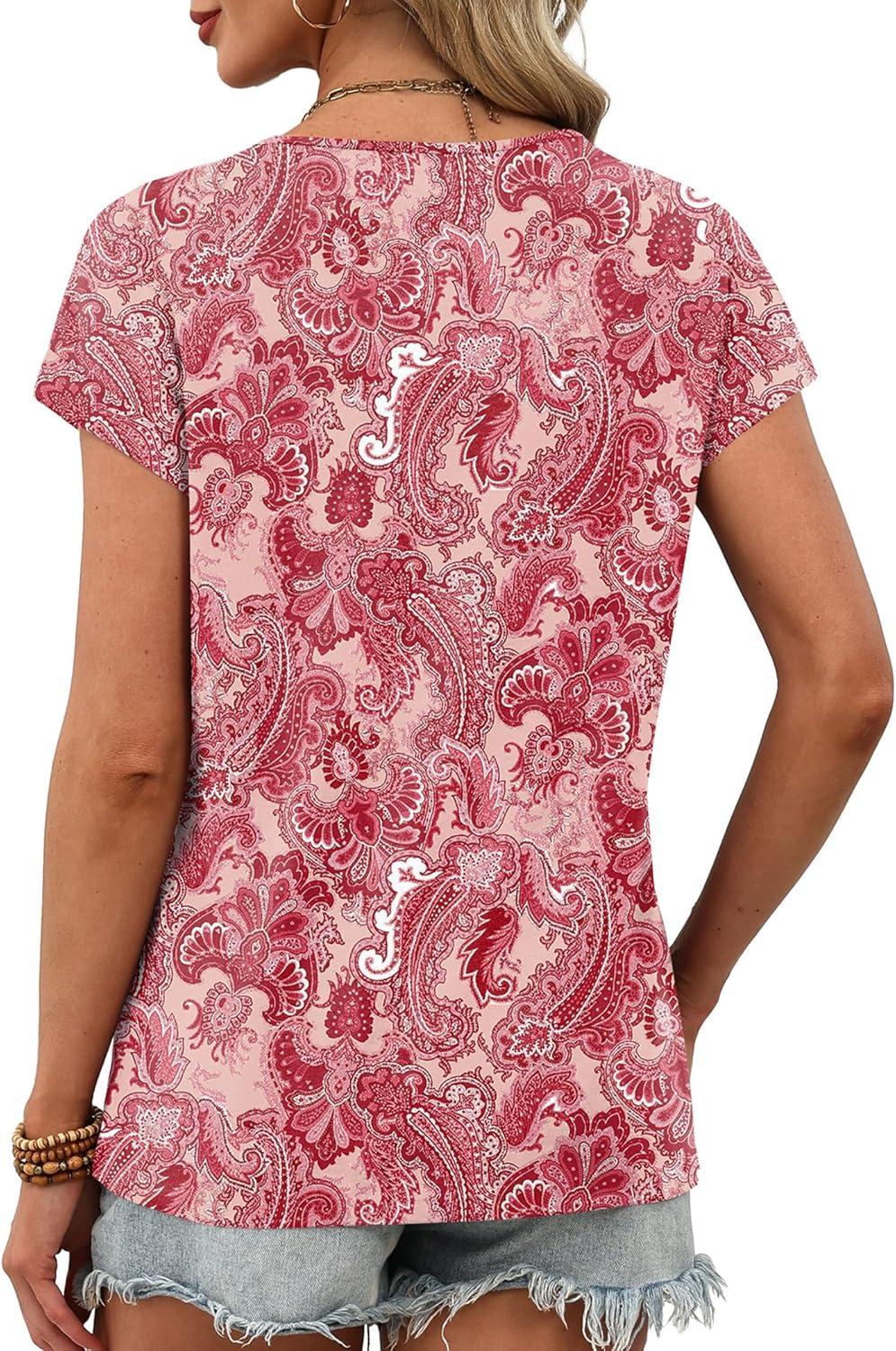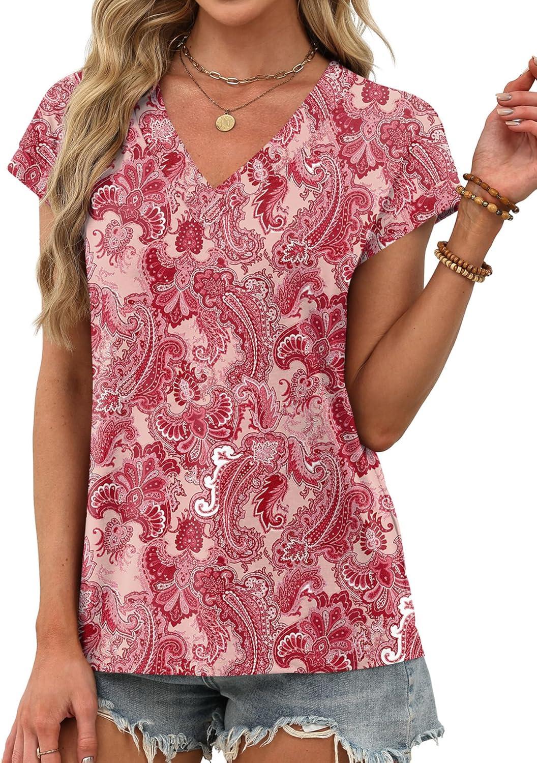XIEERDUO Womens Summer Tops Short Sleeve Shrits 2026 Trendy V Neck Spring Outfits Beach Vacation Clothes(Patterned-pink Print)