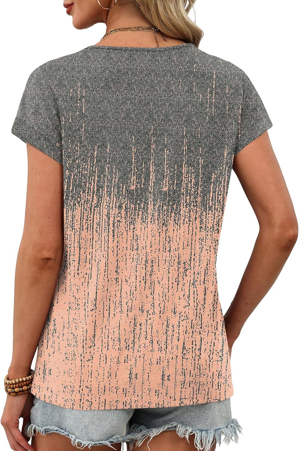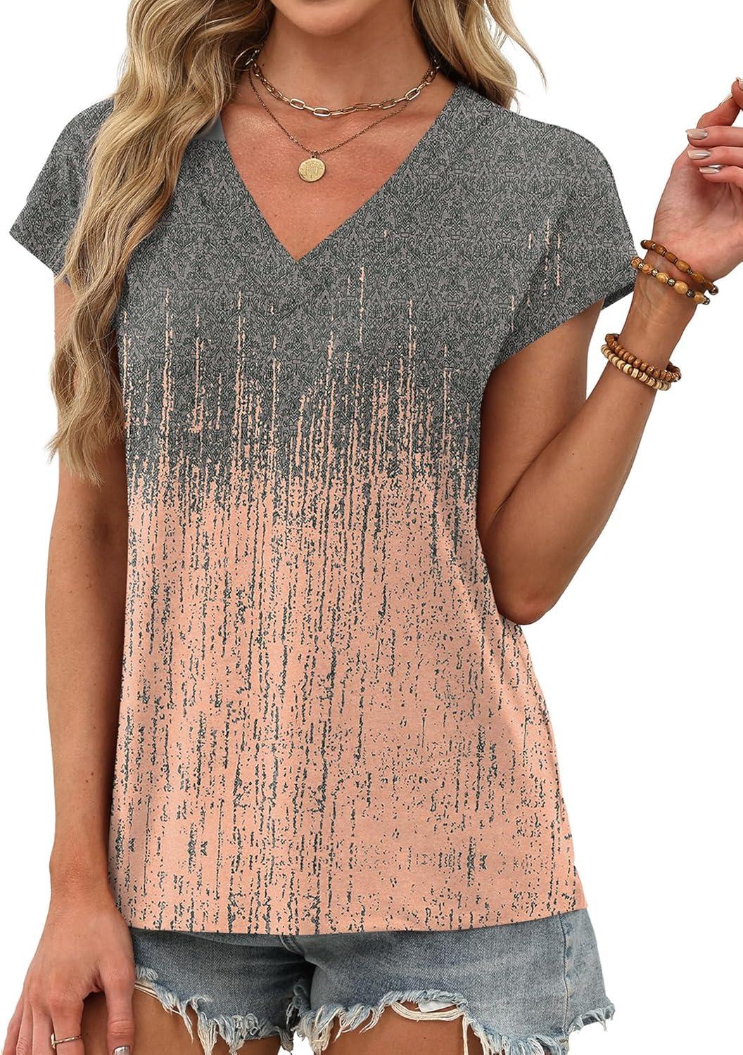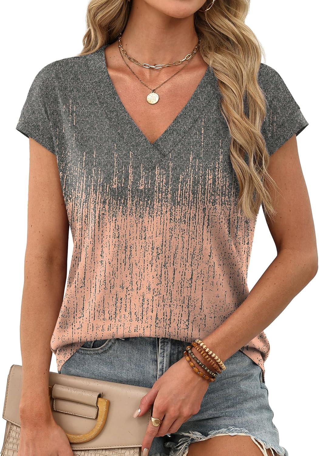 XIEERDUO Womens Summer Tops Short Sleeve Shrits 2026 Trendy V Neck Spring Outfits Beach Vacation Clothes(Patterned-pink Print)