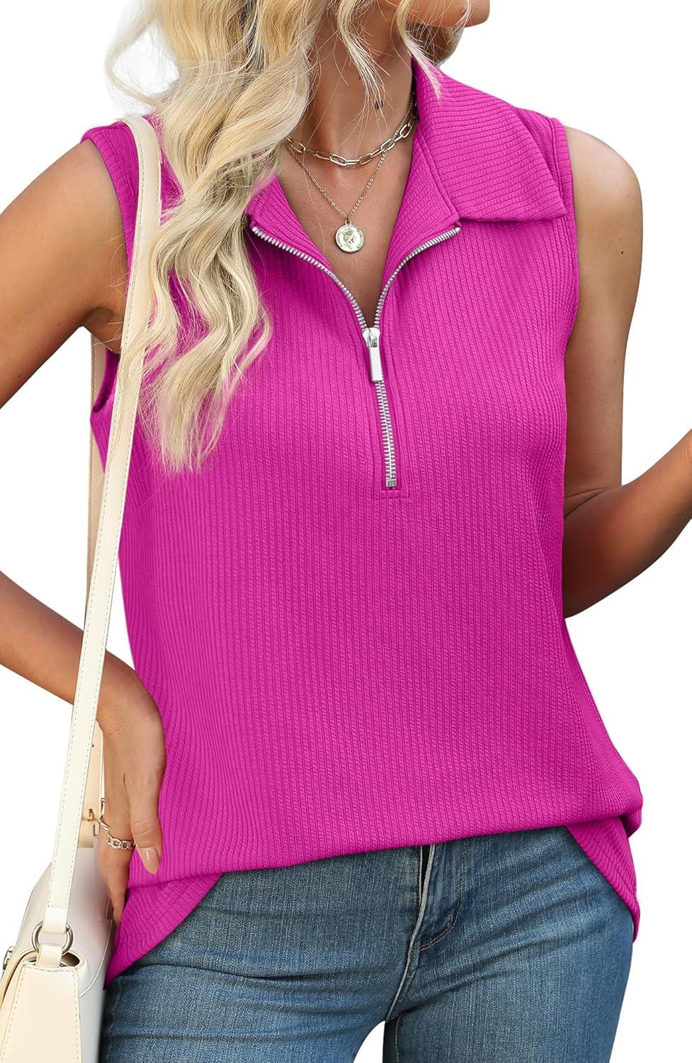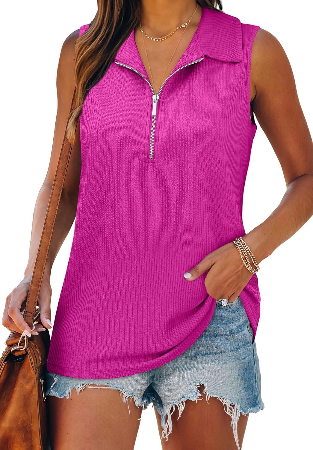 XIEERDUO Womens Summer Tops V Neck Collared Shirts Dressy Casual Ribbed Tank Top with Zipper Loose Fit(B Hot Pink)