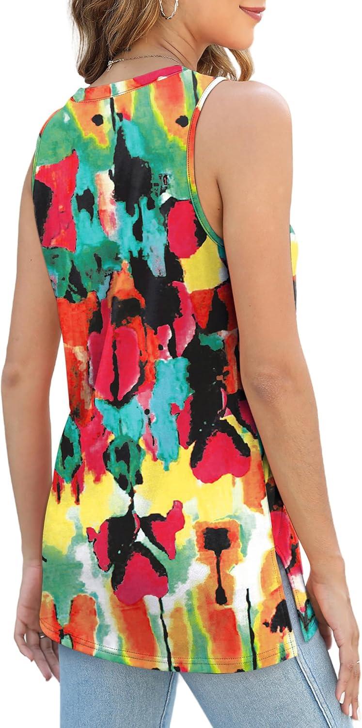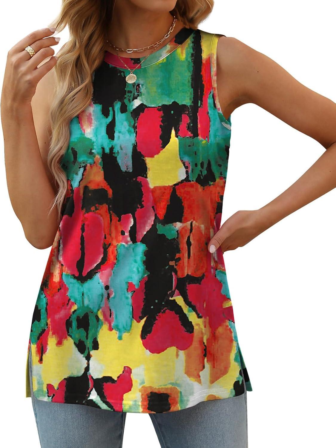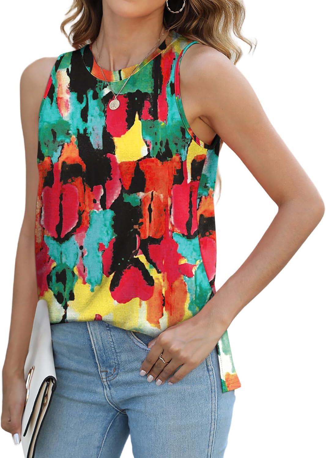 XIEERDUO Womens Tank Tops Crewneck Loose Fit Basic Casual Summer Side Split Sleeveless Shirts(Eb-pink Print)