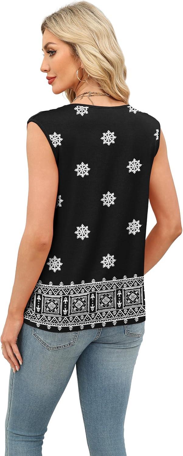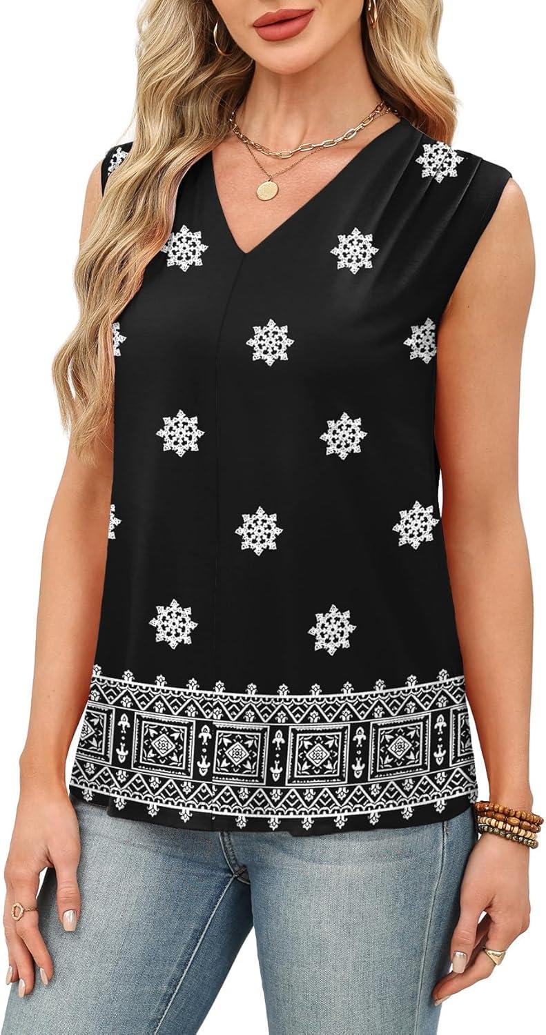 XIEERDUO Womens Tank Tops Loose Fit Casual Fashion Summer Soft Pleated V Neck Sleeveless Blouses(Black White Flowers)