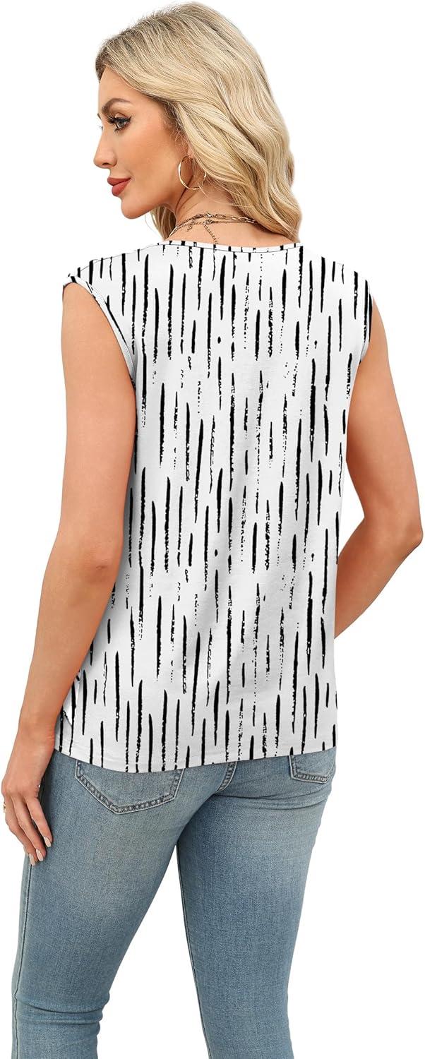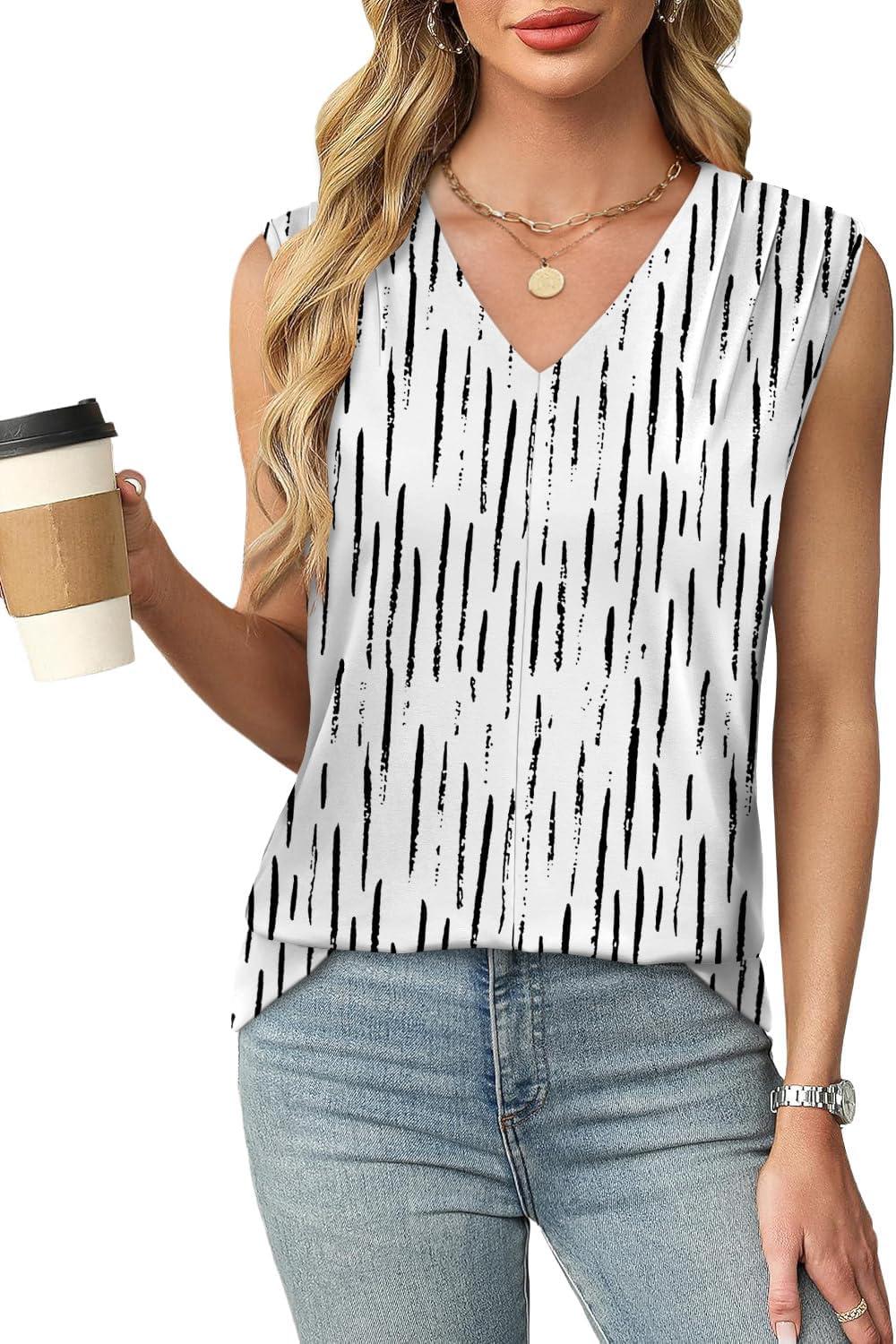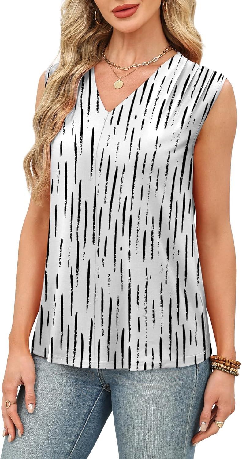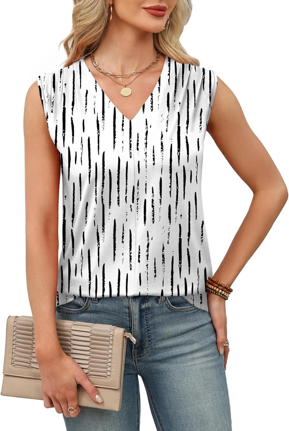 XIEERDUO Womens Tank Tops Loose Fit Casual Fashion Summer Soft Pleated V Neck Sleeveless Blouses(Vertical Stripe Print)