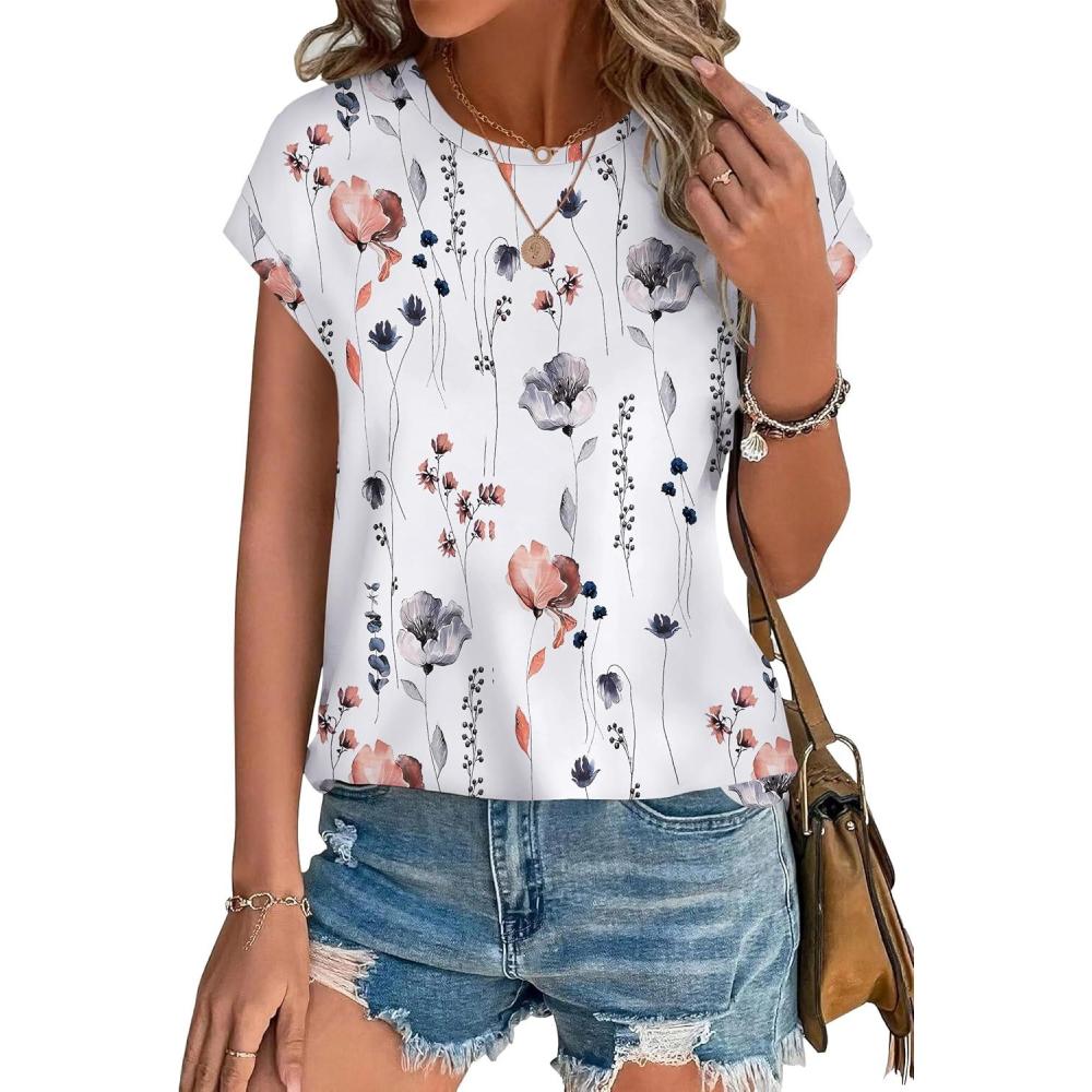 XIEERDUO Womens Tops Short Sleeve Shirts Blouses for Women Dressy Casual Cap Sleeve Tops with Curved Hem(N-white Flower)