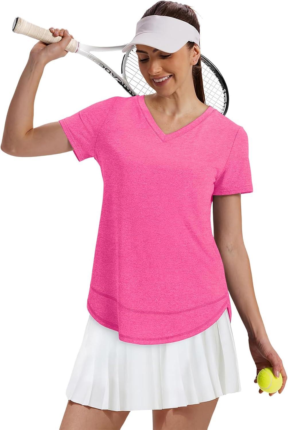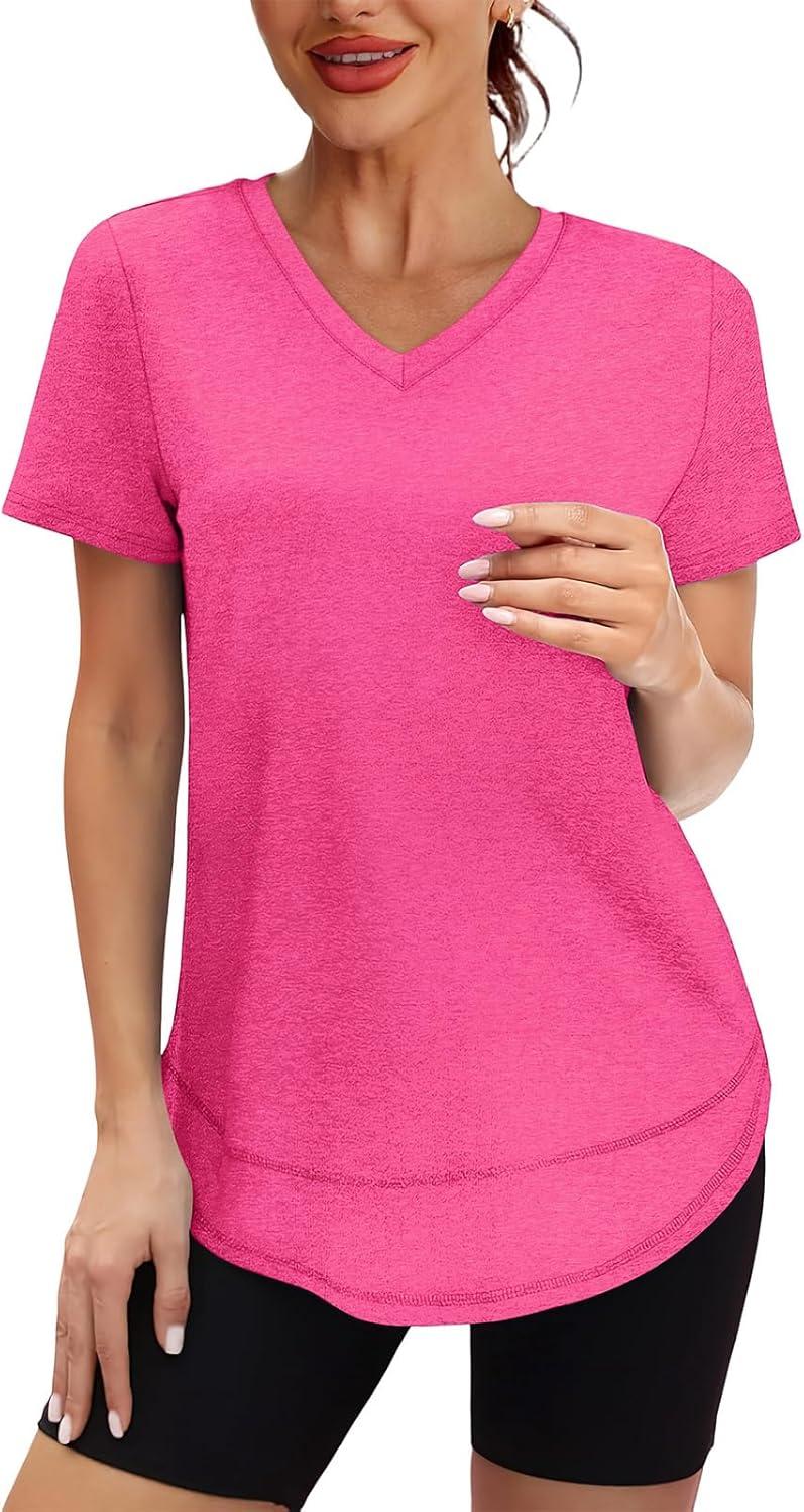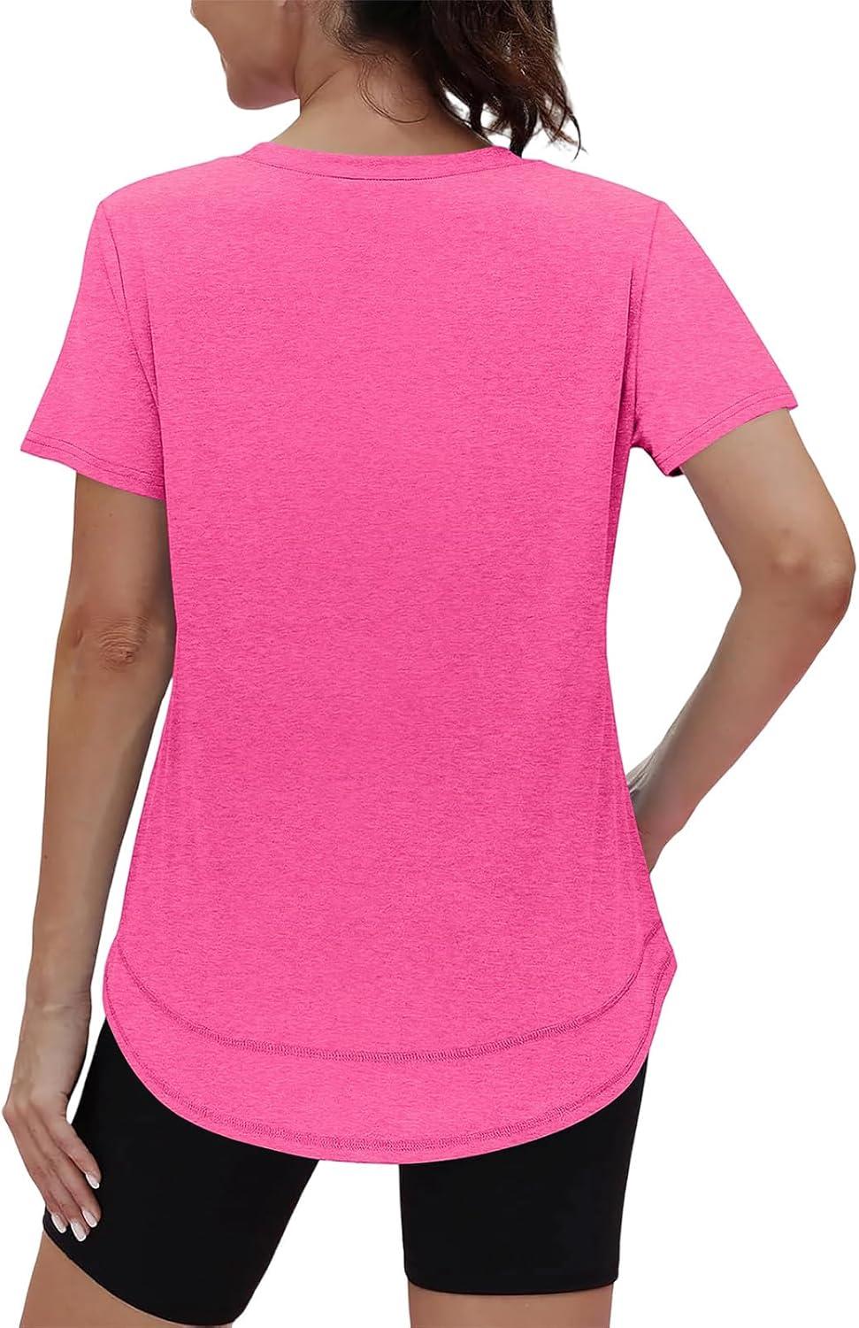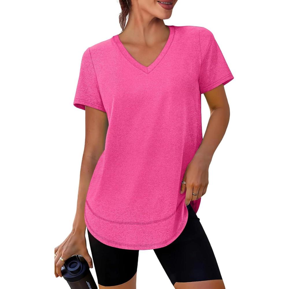 XIEERDUO Womens Workout Tops Short Sleeve Shirts Sun Protection UPF 50+ Quick Dry Outfits for Hiking Running V Neck S-3XL(08 Hot Pink)